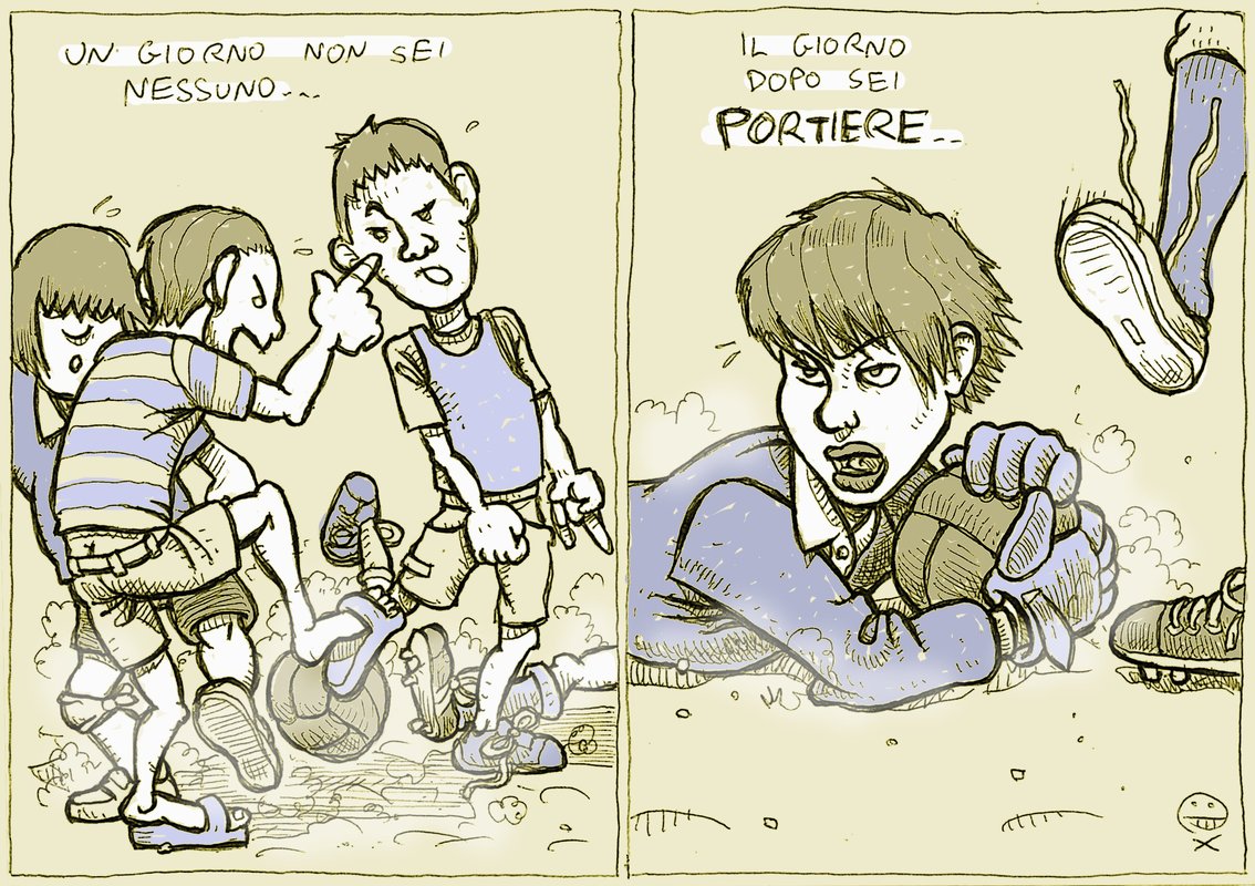 Dopo una infanzia trascorsa in paesi a bassissima densità calcistica, a nove anni mi resi conto di essere bravino in porta, e così mi salvai da una esistenza di mediocrità. Era il 1974, i mondiali di Monaco. Lanciavo una palla di gomma arancione sul muro di casa e la colpivo di rimbalzo a pugni chiusi, così come avevo visto fare al mio idolo Sepp Mayer, guantaio oltre che portiere. Nel mio piccolo ho avuto qualche soddisfazione, ero portiere del Borgo, la frazione pedemontana di Buonabitacolo (i rivali erano quelli del Casale), ho giocato sull’erba dello stadio Collana al Vomero, in qualità di portiere titolare del Liceo Sannazzaro, ho giocato a calcetto con i fratelli Mola (mancava Marco, probabilmente per via del ginocchio). La mia specialità era l’uscita assassina rasoterra, solitamente alternata alla papera sulla punizione a foglia secca. Mio figlio ha deciso di seguire le mie orme, riempendomi di orgoglio. Giuro, non ce l’ho spinto, ha capito da solo che stando tra i pali ci si pone sopra, aldilà del gioco. After a childhood spent in countries with low soccer density, at nine I realized I was a pretty good goalkeeper, so I saved myself from a life of mediocrity. It was in 1974, Munchen World Cup. I threw an orange rubber ball against the wall, hitting it with clenched fists on the rebound, as I had seen my idol Sepp Mayer do, great goalkeeper and glove maker. I had my satisfactions, I was number one of Borgo, the foothills part of Buonabitacolo (rivals were those of Casale), I played on the grass of the Collana stadium in Vomero, goalkeeper of Sannazzaro high school, I played soccer with brothers Mola (Marco was missing, probably because of his knee). My specialty was a killer ground level exit, usually alternated with a missed catch on a “falling leaf” style parabola. My son decided to follow my footsteps, filling me with pride. I swear, I didn’t influence him, he realized by himself that being alone between the posts arises you above, beyond the game. Una bella settimana di allenamenti, con uscite il lunedì, martedì, giovedì e venerdì, incurante della pioggia, 8km, stretching e recupero. Sarà la mancanza di lavori, ma mi sento stanco… Link to this articlePortiere! / Goalkeeper!