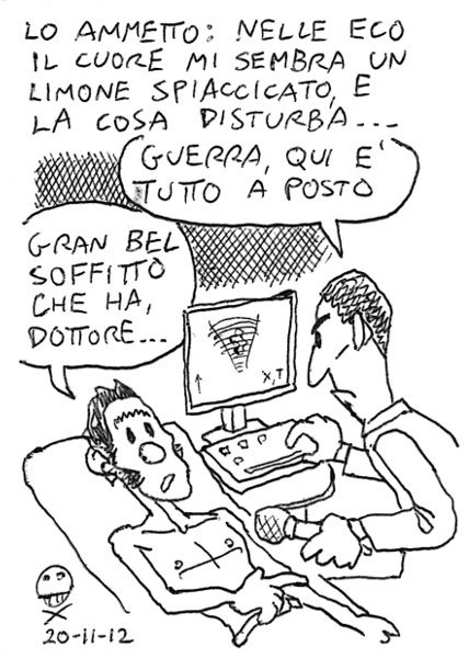 Fatti gli accertamenti, mi sono precipitato con molta calma dal medico sportivo per fargli vedere i risultati e confrontarli con quelli di due anni fa. Pare che il diametro telediastolico del ventricolo sinistro sia passato dai 48 ai 51 mm in due anni. Questo può voler dire tante cose: che il mio cuore si sta rapidamente spampanando; che mi trovo in uno stato di forma diverso (il cuore si modifica con l’attività fisica); che ero più o meno idratato; che la misura (una delle due) è stata presa male. Nel dubbio, attività fisica sì, attività agonistica no. Va bene, dottore, obbedisco, ma che dire del diametro telediastolico del ventricolo destro, negli ultimi due anni si è ristretto da 29 a 27 mm, rientrando quasi nei valori normali (massimo 26)… Dottore!.. Dottore! Ascertainements, done! Now back to the sports doctor to comment and confront with historic data. It looks like the size of my heart has increased of about 3 millimeters in the last two years, this can mean the following: my heart is on it’s way to explode; I’m more in shape than I used to be; I had an extra glass of water; measurement was inaccurate. What do we do next? Nothing, just have fun, no workouts, no races. And that’s it.   Lunedì una decina di km dentro e fuori la villa, con la salita di via Vitellia, martedì un po’ di meno perché mia figlia si deve svegliare prima, poi visita medica in mattinata. Venerdì come martedì, fa veramente freddo, faccio una fatica boia, le gambe protette dalla tuta. La domenica un’ora e un quarto di vento, sole e freddo lungo la recinzione occidentale di villa Pamphili. Bellissimo! Link to this article