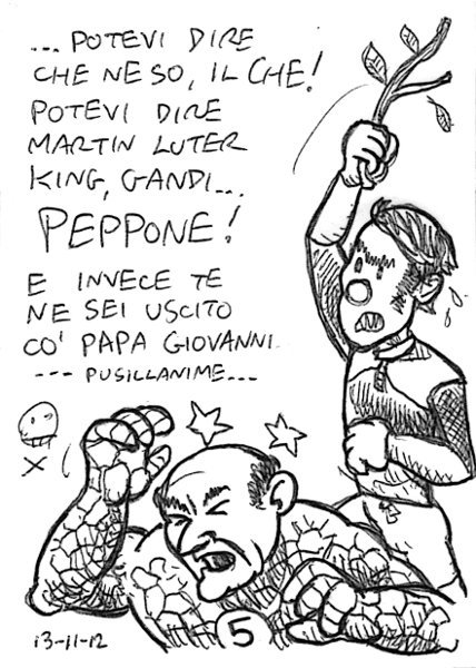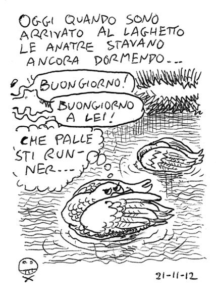 Fino a qualche mese fa avevo due blog, uno interamente dedicato alla corsa, l’altro onnicomprensivo, vignette politiche, illustrazioni ecc. Per motivi soprattutto di tempo, ho fatto convergere il diario podistico nel blog “generalista”, dedicandogli un’apposita categoria. Questa contiguità ha avuto un effetto imprevisto: le vignette sportive hanno cominciato a specchiarsi in quelle politiche, e quelle ispirate all’attualità sono diventate più personali. Voglio provare a non contrastare questa tendenza, e vedere cosa ne esce fuori. Ovviamente salta il discorso “un allenamento, una vignetta”, raccoglierò assieme tutte le vignette della settimana, quindi (si spera) le vignette saranno più degli allenamenti. Up to some months ago, I had two blogs, the graphic running log and the comics and illustrations one. Having poor time, I converged the two, placing the running log among the political sketches. Unexpectedly, sketches from different blogs started to merge, so from now on I will collect them in the same post on a weekly basis. This means (I hope) that I will have more sketches than trainings to show. Lunedì una decina di km dentro e fuori la villa, con la salita di via Vitellia, martedì un’oretta, con due salite. Sabato quasi un’ora di fondo lento nel fango di villa Pamphili: inebriante! Settimana piovosa, ed io odio correre sotto l’acqua. Link to this article