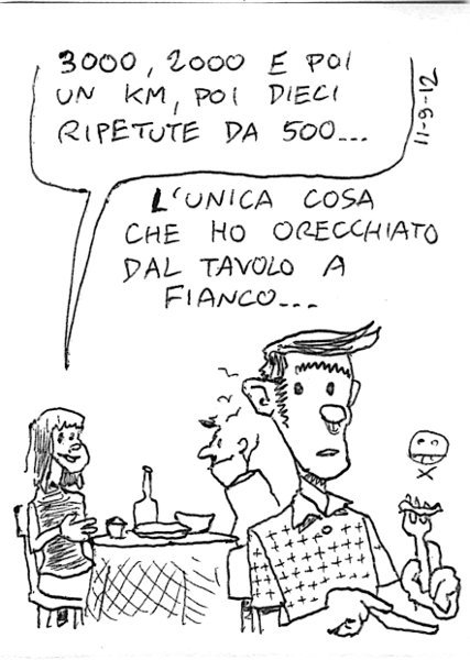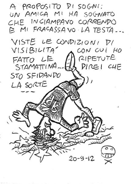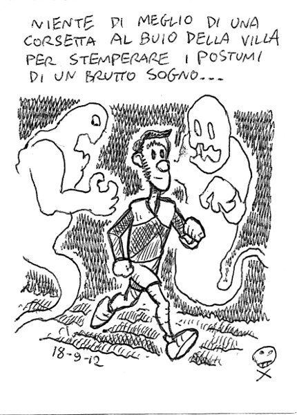 Sogno spesso, e mi faccio influenzare dai sogni: se l’ho sognato, una ragione ci sarà. Ma non amo i simbolismi, se sogno che mi cascano i denti vuol dire che ho paura di rimanere sdentato, non che non mi si rizzi l’uccello. E’ il tuo cervello che ti mette alla prova, presentandoti una situazione scabrosa: sarai in grado di superarla? Se la superi in sogno, puoi star tranquillo nella vita reale! – I dream a lot, and dreams influence my life: if you dream it, you care about it. But I don’t like symbols: if I dream of falling teeth it means that I don’t want to be toothless, not impotent! It’s your brain that tests your reactions: if you can make it during sleep, you’ll make it in real life! Martedì 18, AM villa Pamphili. Un’ora di fondo lento. Giovedì 20, AM villa Pamphili. Riscaldamento, stretching, tre giri lento, medio e veloce, poi tre ripetute da 500 (2’00 – 1’54), scarico. Venerdì 21, AM villa Pamphili. 10km di fondo lento. Domenica 23, PM villa Pamphili. 35′, poi altri 10′ di fondo lento, stretching. Pessima prova. Link to this articleProgrammazione / Scheduling