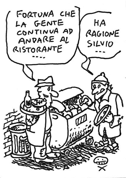 Ha ragione Silvio. Un giorno andremo da lui e gli chiederemo di tornare, però stavolta porteremo corda e sapone… – Former Prime Minister Silvio Berlusconi denied that there was a crisis going on, claiming that people still had money in their pocket… “Luckily people keep on goin’ to the restaurant…” -“Berlusconi’s right…” Link to this articleGargarism begins at home