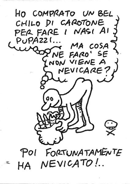 L’idea l’avevo già usata per presentare la vignetta del vecchio che cade sul sacchetto di sale, quindi prima della nevicata. Le maledizioni nei confronti del nostro sindaco Alemanno si sprecano: alcuni cittadini di mia stretta conoscenza hanno passato sei ore in macchina per tornare a casa dal lavoro. I sacchetti di sale erano gelosamente custoditi nelle dispense della protezione civile… – I’ve bought plenty of big carrots just to fit the noses of snow men. What if it doesn’t snow? (Fortunately it did…) Link to this article