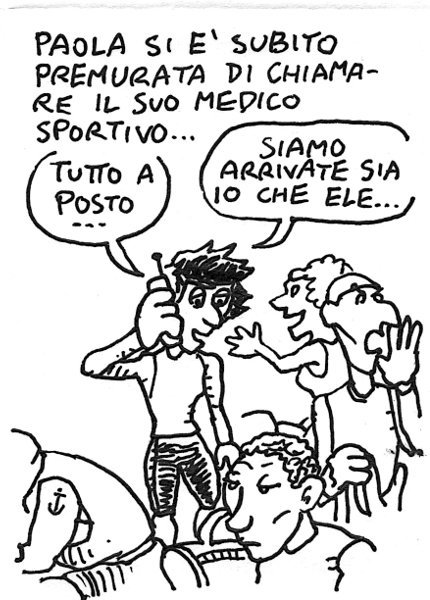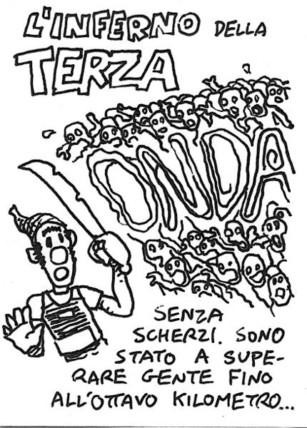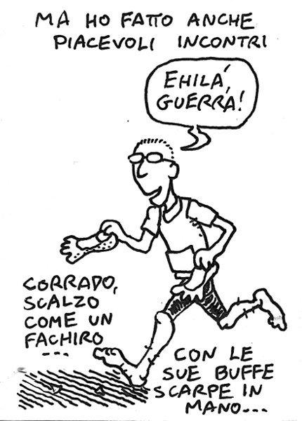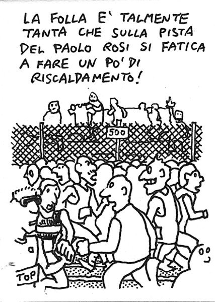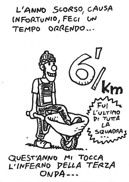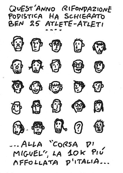 Resoconto a fumetti della Corsa di Miguel, classica 10k. – Graphic report of Miguel’s Race, a classic 10k… Tredicesima edizione per quella che si avvia ad essere la 10k più partecipata d’Italia, probabilmente anche per la piacevolezza del percorso. Moltissimi partecipanti anche per Rifondazione Podistica, tra cui tantissime ragazze: pare una scampagnata, una riunione di famiglia. Io non sono al massimo della forma, gli allenamenti antelucani sono costanti, ma poco qualitativi, per cui mi pongo l’obbiettivo dei 4’30. A casa preparazione meticolosa, pettorale addirittura spillato la sera prima, arrivo in perfetto orario, pisciatina e riscaldamento (alquanto ridotto, c’è un sacco di gente in pista). A causa di una non brillante prestazione l’anno scorso, mi infilo nel terzo e ultimo scaglione e raggiungo il Presidente, protetto dalle aquilifere Rita e Vera. La partenza è al rallentatore, una folla compatta impedisce di impostare un ritmo decente, e sarà così fino al terzo km, tra gente che ti taglia la strada e i mortacci alle spalle quando a tagliarla sei tu. Verso il secondo km sento un dolore davanti la tibia destra, rimpiango di non aver rinfrescato un po’ le gambe il giorno prima. Supero e saluto Paola, poi Corrado che correrà tutti e dieci km a piedi nudi. Verso metà gara, al ponte Mazzini, il dolore si scioglie, il ritmo si imposta, ma in alcune strettoie è ancora uno scartare e cambiare passo. Incontro l’omonimo Pompili, si fa un po’ di ragionamenti sui tempi, poi lo lascio. Sempre emozionante il passaggio di ponte Milvio, mancano due km ma ancora mi trovo davanti gruppetti lenti. Finalmente tutti accelerano, sentono la fine della gara, forse potrei dare di più ma mi sembra sciocco strafare. Arrivo in 45’35”, 1434° in classifica assoluta, l’anno prossimo dovrei meritarmi il secondo scaglione. 40 secondi prima di me Pinelli che, guidato da una scafatissima Eleonora, si è andato a piazzare sul cordone di partenza, evitandosi un sacco di intoppi. Esperienza, ragazzi! Link to this article