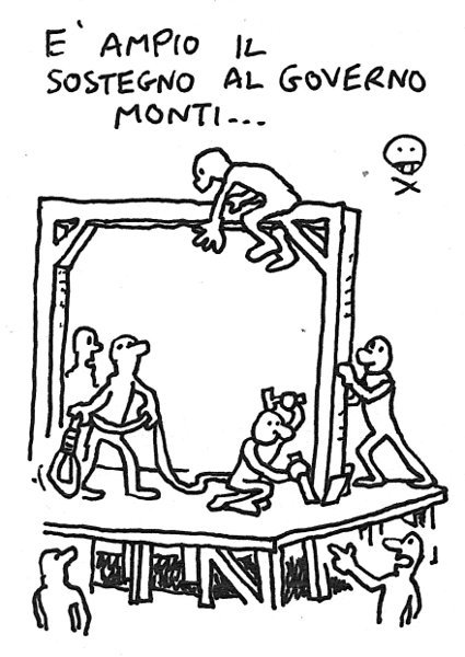Non vorrei fare l’uccellaccio del malaugurio, ma quando il povero Monti finirà sulla graticola andremo tutti a prostrarci davanti a Sua Maestà… Lo spunto iniziale lo devo a Klaus. – It’s not so easy to translate this one: about a liar we say that he promised beaches and mountains (mari e monti), about a cheap skate we say that he served us pizza and figs, in case of inaccuracy we say “a butt and a span”, about something that happens instantly we say that it’s cooked and eaten. When all of these guys will pass by we will have Berlusconi back… Link to this articleAmpio sostegno / Broad support
