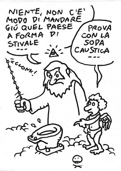 Ehi ragazzi, qui stanno tentando di farci fuori, tra spread, alluvioni e motociclisti morti. Stringiamoci attorno al nostro dimettendo presidente del consiglio e soffochiamolo! – There must be a plot against Italy. We were just fine a couple of months ago, now it’s a disaster. -“No way to flush that boot shaped country…” -“Try with sodium hydroxide…” Link to this article