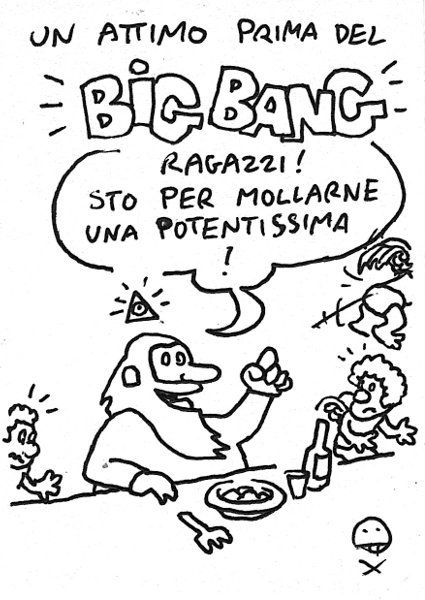 La scienza si è occupata dei primi attimi dopo il Big Bang, ma mai di quelli prima, e ciò che non è investigabile dalla scienza lo è dalla teologia. La tesi della vignetta è che non ci sia un disegno intelligente dietro la creazione, ma un moto spontaneo. Un po’ quello che ha fatto Renzi alla Leopolda… – Just few seconds before Big Bang: -“Hey guys! Here comes the Mighty Flatulence!”… There is no intelligent design behind creation, but a spontaneous peristaltic movement… Link to this articleComplesso di inferiorità / Inferiority complex