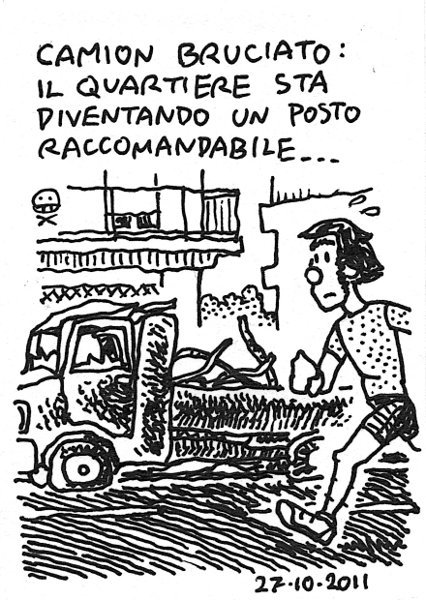 Il quartiere dove ho lo studio è a ridosso della Magliana, ed i benefici influssi del crimine organizzato si sono fatti sentire negli ultimi tempi: un po’ di sparatorie, un po’ di cambi di gestione, un po’ di macchine bruciate… – I live and work pretty near to Magliana, a neighborhood in Rome historically involved in organized crime. Lately, in these times of evil, I’ve seen the signs of increasing activities, like this burnt truck. AM/PM, villa Giuseppina. 3km L, STR, 1km + R (3’50, 3’53). Dopo una notte un po’ agitata ho deciso di saltare l’allenamento antelucano, correndo prima di pranzo nel mitico circuito di villa Giuseppina. Ma c’è qualcosa che non va: fin dal riscaldamento mi sentivo stanco, ho attaccato le ripetute e già alla seconda ero distrutto. La velocità è ok, scendo sotto i quattro minuti quasi senza accorgermene, ma è la tenuta che manca. Devo rivedere un po’ i miei allenamenti, ritornare al ritmo dell’estate: lun 10km, mer lavoro, gio 10km, sab lungo. Link to this article