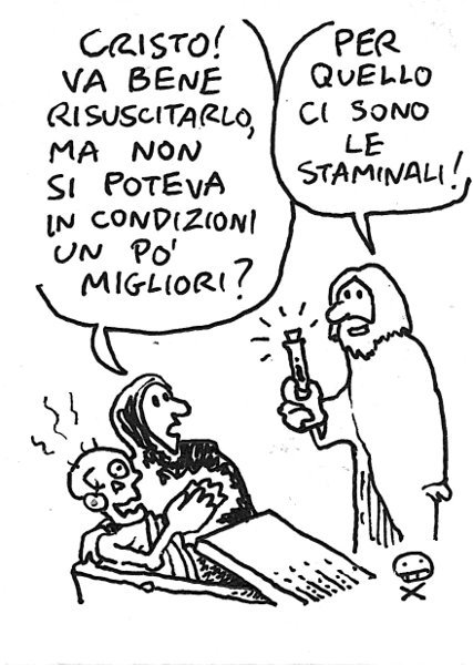 Questa l’ho pensata nel bel mezzo di un funerale. L’officiante sottolineava il turbamento di Gesù di fronte al tumulo di Lazzaro. Anche i figli di Dio ogni tanto hanno bisogno di una mano, e non è sempre la Chiesa a dargliela… – Vatican is strictly against embryo stem cell research. -“Jesus, it’s ok resurrecting him, but why not in a better shape?” -“We have stem cells for that!” Link to this article