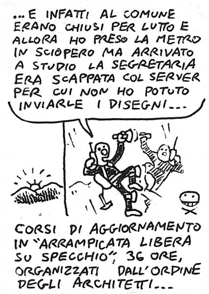 Una buona parte dell’energia viene sprecata nel tentativo di trovare scuse plausibili. Certo che se non telefonassero uno avrebbe tempo di lavorare! – In italian when you look for pathetic excuses they say that you are climbing on glass. As an architect I’m a good climber. Sure that if they didn’t call all the time, I’d have the time to finish the job! In the sketch climbing lessons are given by the Chamber of Architects. Link to this articleSante staminali / Holy stem cells
