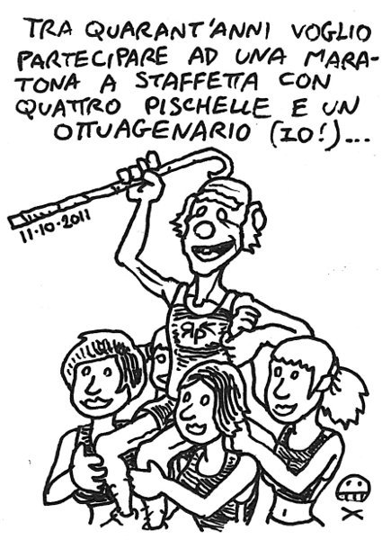 La maratona a staffetta cui parteciperò sabato richiede 5 frazionisti di cui la terza donna e il quarto over 45. Considerando che la tendenza vede un aumento del running femminile e di quello della terza età ci avviamo verso il ribaltamento descritto nella vignetta… – Saturday I’ll run a relay marathon. Each team has 5 members, third must be female and fourth over 45. There is evidence of a positive trend both in female and senior running, so we’re going towards an overturn as in the sketch… AM, Villa Pamphili. 3.5km L, 1km (3’52), 1km L, 1km (3’50), 1km L, 1km 4’00), STR e defatigamento. Ho fatto 6.5km alla media di 4’30, ma il mio obbiettivo per sabato è 4’15! Link to this articleUna bara strafiga / Cool coffin