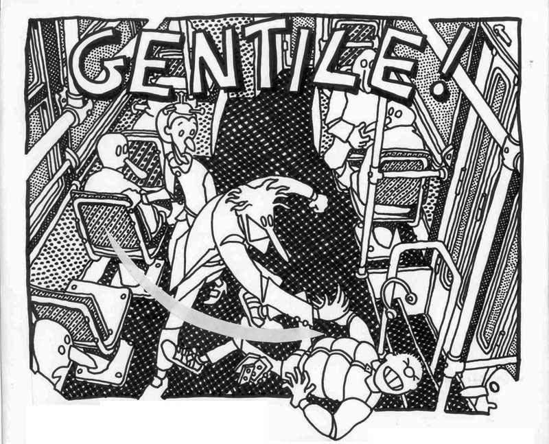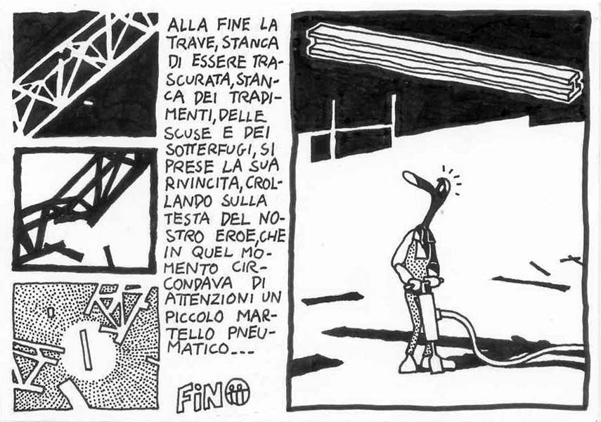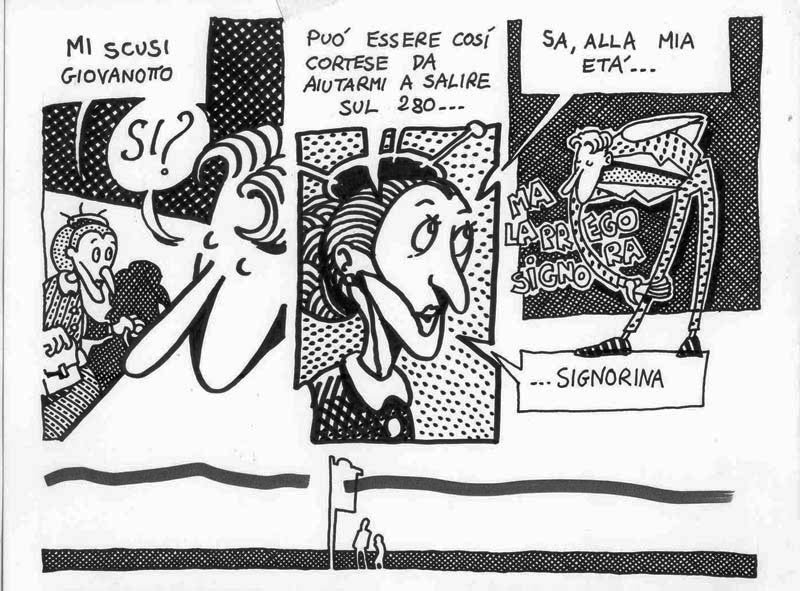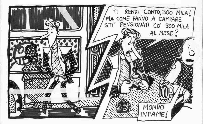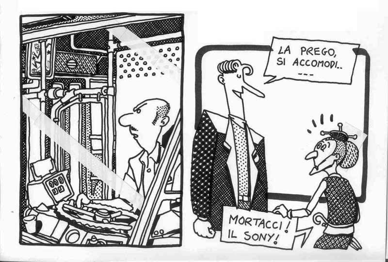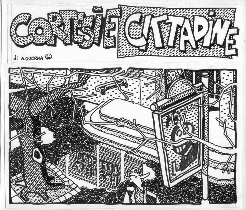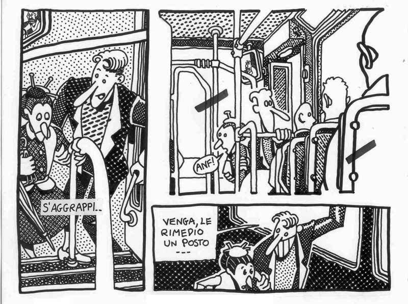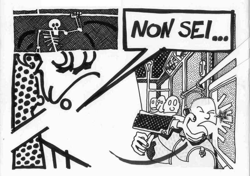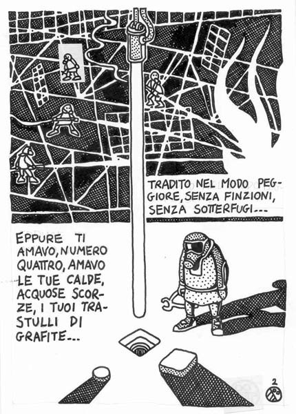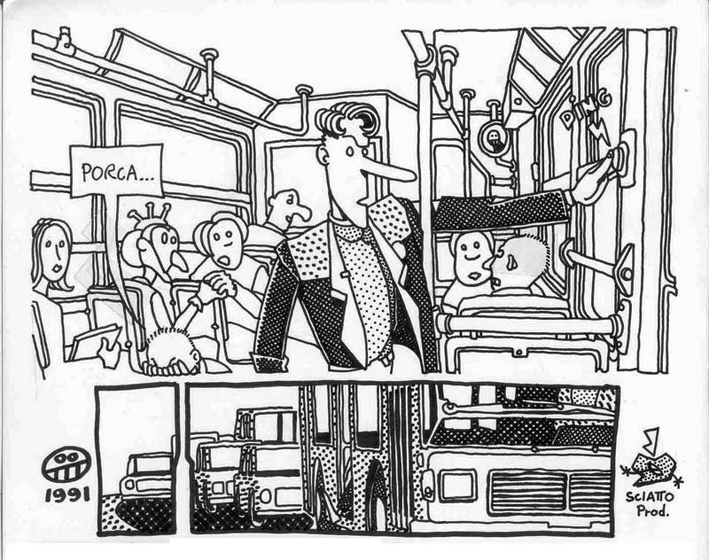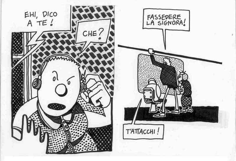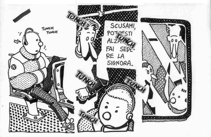 I made this comic in 1991, under the influence of A. Pazienza‘s work (note the badge that the main character wears on his suit) At that time I was a bus rider, and a militant of Sciattoproduzie, an art collective (note the heart shaped symbol in one of the last pages). Line 280 still exists, the post office is near Piazza Mazzini, in Rome. For a better display, I cut the original pages in two. I must be honest, I also changed the final: in the original comic the Hero and the Techno Addict were not partners. Link to this articleUn buon inizio / A fresh start