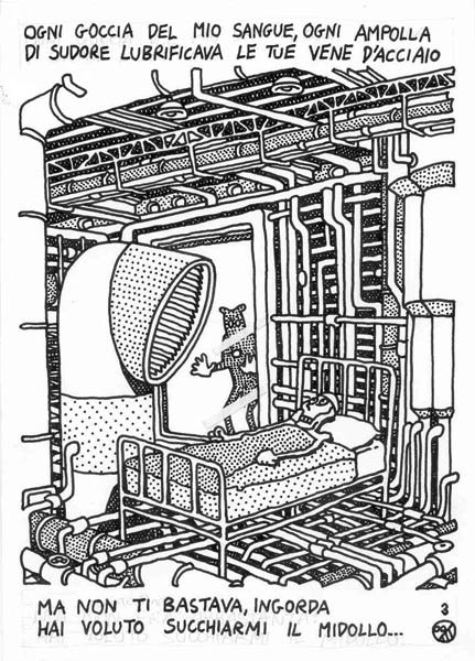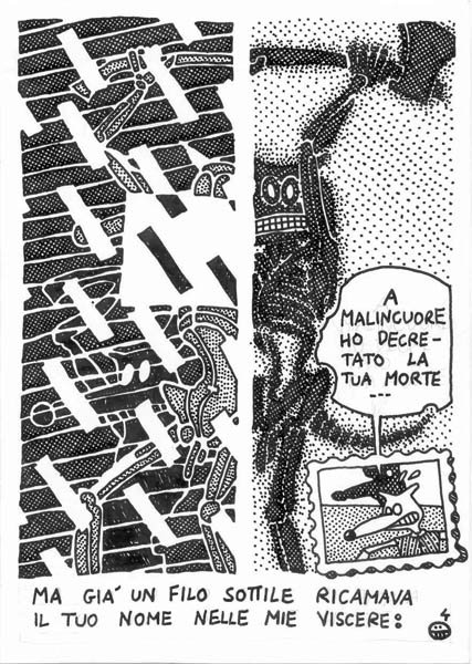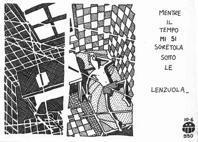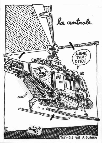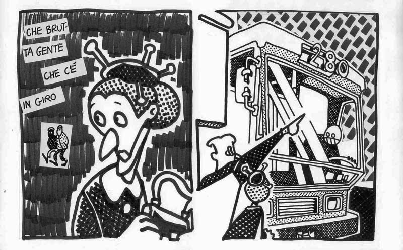 I made this comic in 1992, I think. At that time everything was cyberpunk, and I added my little tile in the construction of the Machine. Similar subjects can be found in the S.H.E. animation. Note the Sciattoproduzie symbol on page three. Even if it was a solo production, I underlined my membership to the collective. There are some Apple Macintosh generated images, wireframes and pop art patterns mixed with handmade items: actually I aspired to “draw like a computer”. Final is a little bit lousy, it deserved some extra drawing.