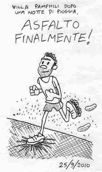 Questa è la prima vignetta del Visual Running Log, che potete vedere anche nella versione originale sul sito di Rifondazione Podistica. – This is the first entry of my Visual Running Log, originally posted on my team’s website. The track was muddy after a hard rain. AM, Villa Pamphili. No GIN, 2+1 km. (L+4’26), STR, 1600+400 (4’13+L), R, 1km 4’23, R, 1km prog. 4’07, 2km L, STR. Un giorno di riposo in più e l’aria frizzante dopo una notte di pioggia mi hanno dato la carica. Volevo riprovare la serie 1600+400 ma ho fallito. Incontrato Stefano (Leonardi) reduce da un intervento importante. Al secondo riposo ho dovuto pulire le scarpe che erano piene di fango Link to this articleThe Original Plant