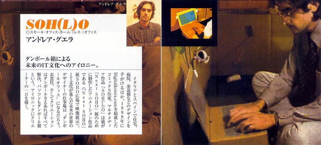 In 2002 Elly Nagaoka asked me to produce an animation related to an architectural exhibition titled SmallOfficeHomeOffice that took place in Tokyo. Starring Gabriele Guerra as the Homeless Employee, the song is “Miss Brown” by Switchyard. _–