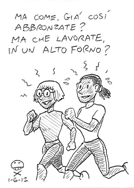 C’è un gruppetto di ragazze (ragazze per modo di dire) che incrocio quotidianamente a villa Pamphili. Tra me e me le chiamo “le tre grazie”. Corrono bene, non c’è che dire, e quando sono in gruppo si sentono arrivare da almeno mezzo km di distanza (giuro!). Qui sono solo in due, l’altra aveva il turno al reparto presse e non si è abbronzata… – Already so tanned? Do you work in a blast furnace? AM, villa Pamphili. 10km di fondo lento. Link to this article