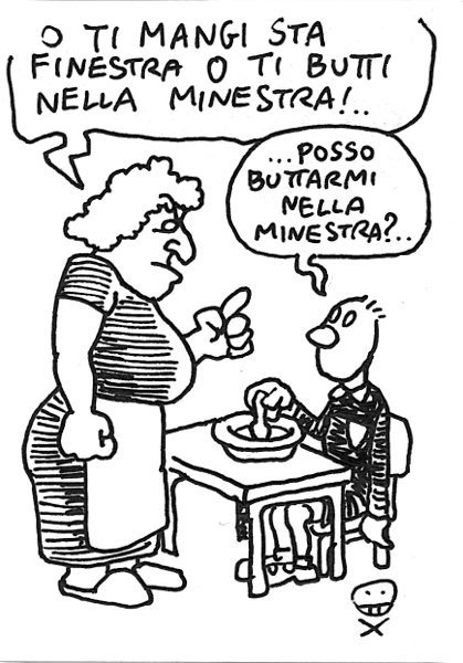 Basta poco per svilire la carica impositiva di un detto in rima bacata tra i più riusciti del nostro repertorio linguistico… – When you have no choice, italians say: eat the soup (minestra) or jump from the window (finestra). The lady mistakes, and gives the kid the opportunity to throw the soup (la) out of the window instead of himself (ti). Link to this articleL’attesa / Waiting