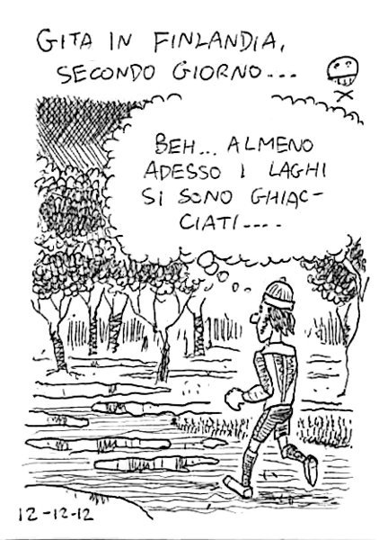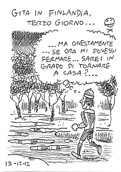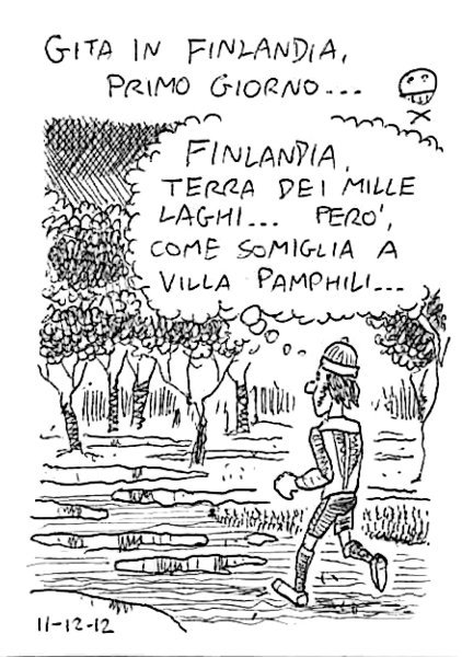 In una settimana fredda e piovosa inanello tre allenamenti fotocopia nel buio di villa Pamphili, per l’occasione trasformata in una provincia Finlandese. Con il termometro intorno allo zero accuso qualche difficoltà, fatico a riscaldarmi ed ho paura che un qualsiasi incidente banale mi costringa ad un gelido ritorno a casa. E’ anche la settimana delle grandi, distopiche manovre nel centro-destra (Monti si-no-forse), e della chiamata alle armi del padre padrone del MS5 (“Ci attendono due mesi di guerra!”) During a cold and rainy week, three trainings in a row in the dark of villa Pamphili, transformed in a finnish landscape. Low temperatures put me in distress, I’m unable to heat up: what if a stupid accident forces me to a chilling walk home? Martedì, mercoledì e giovedì una decina di km dentro e fuori la villa, con la salita di via Vitellia. Domenica un allenamento ridotto (40’), sono reduce da una notte agitata. Pranzo sociale di Rifondazione Podistica a Riano, con torta strepitosa (posterò una foto). Link to this articleGita in Finlandia/Trip to Finland