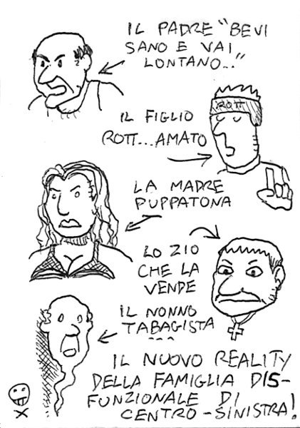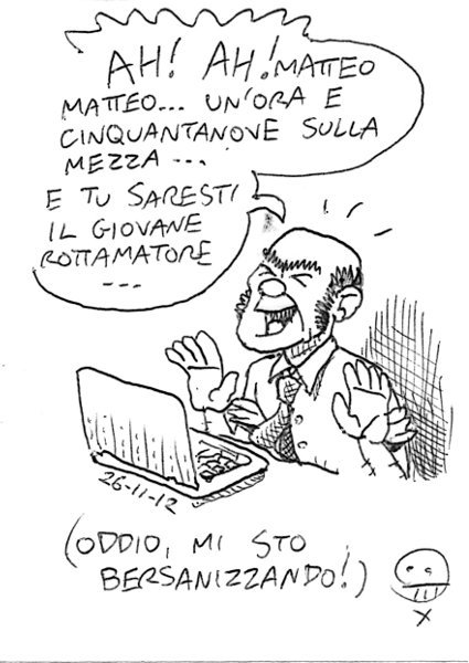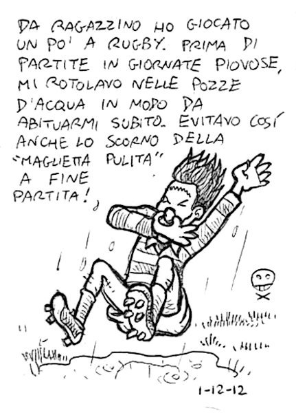 Fino a qualche mese fa avevo due blog, uno interamente dedicato alla corsa, l’altro onnicomprensivo, vignette politiche, illustrazioni ecc. Per motivi soprattutto di tempo, ho fatto convergere il diario podistico nel blog “generalista”, dedicandogli un’apposita categoria. Questa contiguità ha avuto un effetto imprevisto: le vignette sportive hanno cominciato a specchiarsi in quelle politiche, e quelle ispirate all’attualità sono diventate più personali. Voglio provare a non contrastare questa tendenza, e vedere cosa ne esce fuori. Ovviamente salta il discorso “un allenamento, una vignetta”, raccoglierò assieme tutte le vignette della settimana, quindi (si spera) le vignette saranno più degli allenamenti. Up to some months ago, I had two blogs, the graphic running log and the comics and illustrations one. Having poor time, I converged the two, placing the running log among the political sketches. Unexpectedly, sketches from different blogs started to merge, so from now on I will collect them in the same post on a weekly basis. This means (I hope) that I will have more sketches than trainings to show. Lunedì una decina di km dentro e fuori la villa, con la salita di via Vitellia, martedì un’oretta, con due salite. Sabato quasi un’ora di fondo lento nel fango di villa Pamphili: inebriante! Settimana piovosa, ed io odio correre sotto l’acqua. Link to this article
