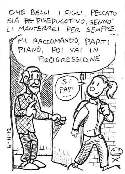 Fino a qualche mese fa avevo due blog, uno interamente dedicato alla corsa, l’altro onnicomprensivo, vignette politiche, illustrazioni ecc. Per motivi soprattutto di tempo, ho fatto convergere il diario podistico nel blog “generalista”, dedicandogli un’apposita categoria. Questa contiguità ha avuto un effetto imprevisto: le vignette sportive hanno cominciato a specchiarsi in quelle politiche, e quelle ispirate all’attualità sono diventate più personali. Voglio provare a non contrastare questa tendenza, e vedere cosa ne esce fuori. Ovviamente salta il discorso “un allenamento, una vignetta”, raccoglierò assieme tutte le vignette della settimana, quindi (si spera) le vignette saranno più degli allenamenti. Up to some months ago, I had two blogs, the graphic running log and the comics and illustrations one. Having poor time, I converged the two, placing the running log among the political sketches. Unexpectedly, sketches from different blogs started to merge, so from now on I will collect them in the same post on a weekly basis. This means (I hope) that I will have more sketches than trainings to show. Lunedì una decina di km dentro e fuori la villa, con la salita di via Vitellia, martedì un’oretta, con due salite. Sabato quasi un’ora di fondo lento nel fango di villa Pamphili: inebriante! Settimana piovosa, ed io odio correre sotto l’acqua. Link to this articleAccertamenti / Ascertainment