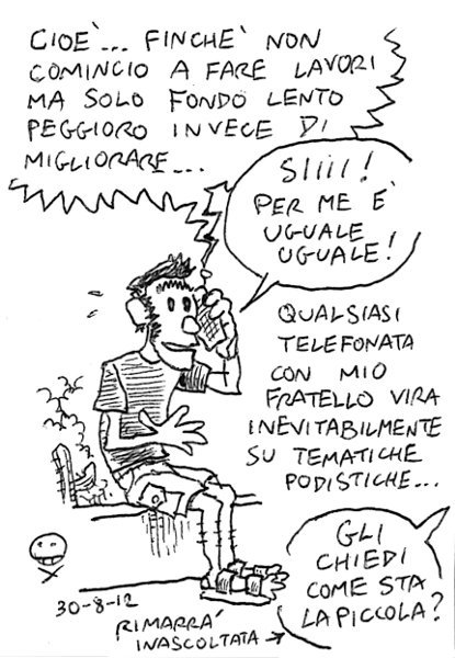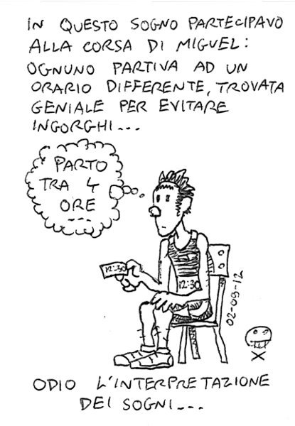 Sogno spesso, e mi faccio influenzare dai sogni: se l’ho sognato, una ragione ci sarà. Ma non amo i simbolismi, se sogno che mi cascano i denti vuol dire che ho paura di rimanere sdentato, non che non mi si rizzi l’uccello. E’ il tuo cervello che ti mette alla prova, presentandoti una situazione scabrosa: sarai in grado di superarla? Se la superi in sogno, puoi star tranquillo nella vita reale! – I dream a lot, and dreams influence my life: if you dream it, you care about it. But I don’t like symbols: if I dream of falling teeth it means that I don’t want to be toothless, not impotent! It’s your brain that tests your reactions: if you can make it during sleep, you’ll make it in real life! Martedì 18, AM villa Pamphili. Un’ora di fondo lento. Giovedì 20, AM villa Pamphili. Riscaldamento, stretching, tre giri lento, medio e veloce, poi tre ripetute da 500 (2’00 – 1’54), scarico. Venerdì 21, AM villa Pamphili. 10km di fondo lento. Domenica 23, PM villa Pamphili. 35′, poi altri 10′ di fondo lento, stretching. Pessima prova. Link to this articleProgrammazione / Scheduling