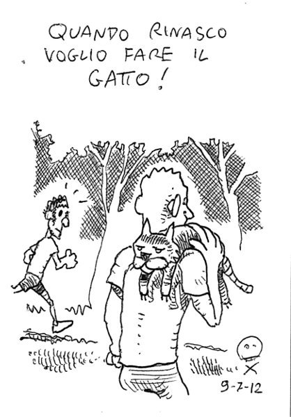 Nonostante esca verso le sette del mattino, il caldo si fa già sentire, e soprattutto l’umidità. – Under a heavy hood of clouds… AM, villa Pamphili. Riscaldamento, STR, giri di campo (530m?) a ritmi alternati (L, 2’15, 2’05, 2’15, 2’01), scarico lungo. Visti i risultati di Frascati non sono sicuro della distanza. Link to this articleIl gatto / The cat
