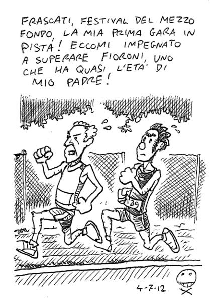 La mia prima gara in pista, se si esclude una partecipazione patetica ai Giochi della Gioventù. Si corre sul tardi allo stadio di Frascati, festival del mezzo fondo. Per la 5000 ci sono anche mio fratello e Roberto “Zed” Tufani, purtroppo in diversa batteria. – My first race on track! Here you can see me passing a fellow that could be my father! Ugo cade in una specie di trappola: si accoda ad un gruppetto che va fortissimo, poco sopra la sua media, ma lui stringe i denti e resiste. Al terzo km il gruppetto… si ferma (si stavano allenando per la 3000?), e mio fratello si ritrova solo, stanco e senza punti di riferimento. Rinuncia. Zed è partito troppo forte, si ferma anche lui. L’onore della squadra risiede sulle mie spalle, nella batteria dei pipponi. Il mio obbiettivo è di andare sotto i 21 minuti, riuscire a correre quattro km a ritmo gara e fare l’ultimo km ai 4’00. Si parte. Il primo km è perfetto, intanto il gruppo si sgrana, mi ritrovo appaiato con Fioroni, un veterano che quando mio fratello ha ripreso a correre quindici anni fa, aveva già cinquant’anni e andava fortissimo. Un po’ mi stacca, poi lo riprendo, per ben due giri provo e rinuncio a sorpassarlo, poi è lui stesso a cedere, mentre altri atleti ci doppiano allegramente. In tutto questo ho perso un po’ di vista la mia condotta di gara, non ricordo nemmeno più quanti giri mancano alla fine. “Due giri…” mi ricordano i giudici. Vado in progressione, francamente ce la metto tutta correndo al massimo negli ultimi metri. Chiudo a 21’15, come se avessi tenuto un ritmo gara perfetto ai 4’15. Obbiettivo mancato, ho avuto qualche flessione a metà gara in tutto quell’andirivieni col Fioroni, ma è stato molto divertente lo stesso. L’anno prossimo ci riprovo! Per il resto della serata mi tocca sorbire le recriminazioni di mio fratello… Link to this articleIl declino / The Decline
