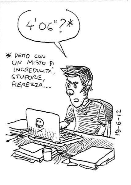 L’ultima volta che avevo visto mio fratello correre in uno stadio era stato al san Paolo di Napoli, finale provinciale dei 1500 ai Giochi della gioventù. Circa trent’anni dopo, stessa distanza, questa volta allo stadio della Farnesina di Roma in occasione dei campionati assoluti regionali. Ugo chiude in 4’26, Boris a 4’22 in un’altra batteria. “Non è cambiato nulla da allora…”, dice sconsolato mio fratello (si riferisce al risultato della gara). – It’s been 30 years or so that I havn’t seen my brother running in a stadium. As always, I wasn’t his lucky charm, but at least I look after his bag… AM, villa Pamphili. Riscaldamento, STR, 3.7km a 4’03, R, 0.53km a 3’40, STR, scarico. Volevo fare 5km a ritmo gara, ma vado troppo veloce e sono costretto a fermarmi. Link to this articleUgo & Boris