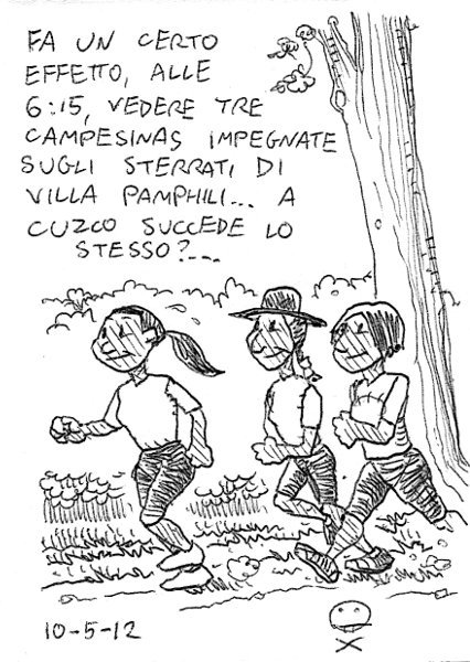 Immagini come queste fanno piacere. Indicano che la base del running si sta allargando perdendo la sua patina testosteronica… – It’s unusual to see three south american ladies running at 6am in the park. Is it the same in Cuzco? AM, villa Pamphili. Riscaldamento, STR, 4g (2km in 8’10), 1g L, 1g RG, R, 2g (1km in 3’58), scarico. 1g=533m, RG=4’15/km. Troppo veloce nella prima frazione, nella seconda non ho fatto partire il cronometro, motivo per cui mi sono fermato. Comunque non avevo tempo per fare altro Link to this article