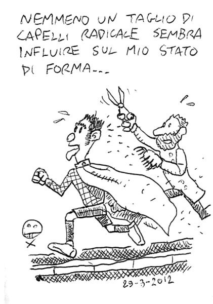 In realtà me li sono tagliati per altri motivi, ma almeno mi avvantaggio sulla fase di asciugatura… – Not even a radical haircut improves my fitness… AM, villa Pamphili. Riscaldamento, STR, 3 x 890m (3’29, 3’34, 3’39), 3’00 più o meno alla stessa velocità, scarico. Impegni di lavoro mi costringono ad affrontare la seduta di ripetute lungo la cancellata esterna della villa, quindi non nelle condizioni migliori (saliscendi, visibilità scarsa). Ciò non basta a giustificare la prova approssimativa, due ripetute in meno e tutte lente eccetto la prima… Link to this article