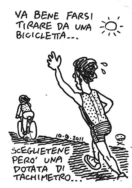 Il giorno prima di una gara è conveniente correre qualche km per sciogliersi le gambe. Sono uscito con mia moglie in bicicletta e mi sono fatto un po’ tirare, eccedendo nella velocità. E tanto per non farsi mancare nulla il sole era già alto, in modo da simulare le condizioni di gara. – It’s ok to run in the wake of a bike, better if it has a speedometer… AM/PM, Tarquinia. 3km RG, 3km FL. Link to this articleBicicletta / Bicycle