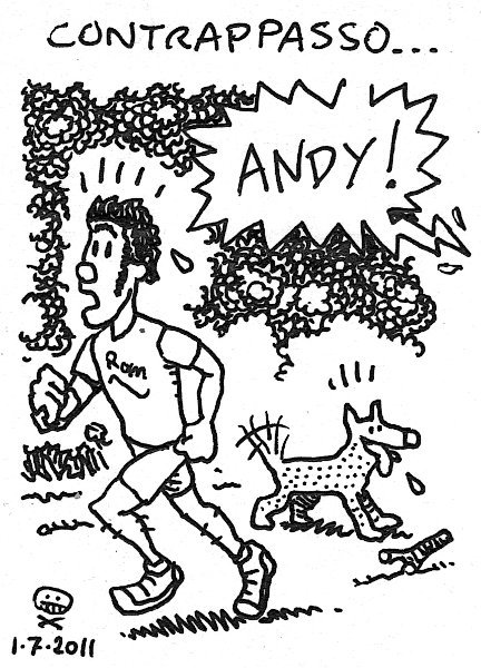 La vignetta si rifà ad un’altra in cui avevo preso in giro mio fratello top runner Ugo (vedi sotto). – Sketch is related to another one I made to tease my top running brother (see below). AM, Villa Pamphili. 12km L (1h), STR. Continua il programma per la 10km. Mi aspettano due settimane di lunghi e lunghissimi. Link to this articleLuglio / July, 2011