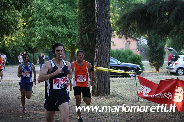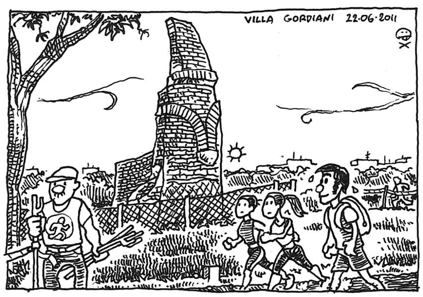 L’Atletica Collatina ha organizzato la sesta edizione della gara del Solstizio (4° Memorial Alfonso Tordi), 5km nel parco di Villa Gordiani al Prenestino. Nella vignetta il post gara, con il sole che tramonta dietro le rovine. – “Solstice race”, 5km in the Villa Gordiani park, Rome. In the sketch you can see the ruins of a roman building. Una gara pomeridiana cui ho aderito per verificare il discorso del ritmo gara. Arrivo con ampio anticipo e prendo il pettorale, mi faccio un giro del parco (ci sono venuto solo di sera a vedere qualche concerto) che è molto bello e frequentatissimo. Mi rifornisco d’acqua e incontro mio fratello e il coach di Rifondazione Podistica, un po’ di riscaldamento e pisciatina nelle frasche. Non mi sento al 100%, durante la giornata ho avuto un leggero mal di testa. Partiamo, sono tre giri facili di polvere, brecciolino e saliscendi nell’erba. Nel primo giro stabilisco il ritmo senza curarmi troppo degli avversari, lo compio in 7’00, esattamente quello che mi ero preposto. Al secondo aumento un po’ l’andatura, comincio a scavalcare chi è partito con troppa foga e chiudo con 10″ di anticipo rispetto al giro precedente. Comincio a sentire un po’ la stanchezza, e non mi so decidere a lanciare un attacco. Verso la fine sento Ugo che mi sprona (figurati, lui è già arrivato da cinque minuti) e finalmente faccio una volata bruciando una manciata di avversari (vedi foto in basso). Tempo: 21’27, se la distanza è corretta la media è di 4’17 al km. Potevo fare qualcosa di più, ma va bene così. Link to this article