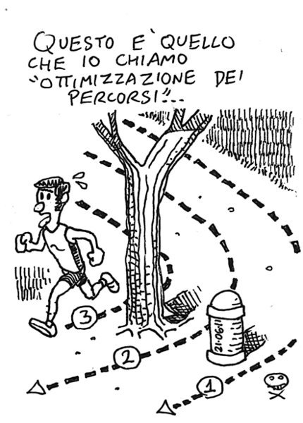 L’Atletica Collatina ha organizzato la sesta edizione della gara del Solstizio (4° Memorial Alfonso Tordi), 5km nel parco di Villa Gordiani al Prenestino. Nella vignetta il post gara, con il sole che tramonta dietro le rovine. – “Solstice race”, 5km in the Villa Gordiani park, Rome. In the sketch you can see the ruins of a roman building. Una gara pomeridiana cui ho aderito per verificare il discorso del ritmo gara. Arrivo con ampio anticipo e prendo il pettorale, mi faccio un giro del parco (ci sono venuto solo di sera a vedere qualche concerto) che è molto bello e frequentatissimo. Mi rifornisco d’acqua e incontro mio fratello e il coach di Rifondazione Podistica, un po’ di riscaldamento e pisciatina nelle frasche. Non mi sento al 100%, durante la giornata ho avuto un leggero mal di testa. Partiamo, sono tre giri facili di polvere, brecciolino e saliscendi nell’erba. Nel primo giro stabilisco il ritmo senza curarmi troppo degli avversari, lo compio in 7’00, esattamente quello che mi ero preposto. Al secondo aumento un po’ l’andatura, comincio a scavalcare chi è partito con troppa foga e chiudo con 10″ di anticipo rispetto al giro precedente. Comincio a sentire un po’ la stanchezza, e non mi so decidere a lanciare un attacco. Verso la fine sento Ugo che mi sprona (figurati, lui è già arrivato da cinque minuti) e finalmente faccio una volata bruciando una manciata di avversari (vedi foto in basso). Tempo: 21’27, se la distanza è corretta la media è di 4’17 al km. Potevo fare qualcosa di più, ma va bene così. Link to this articleOttimizzazione dei percorsi / Route Optimization
