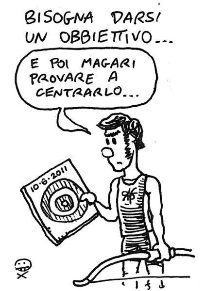 Il mio primo trail ed ultima gara del “Criterium“, una specie di competizione interna alla mia squadra. La vignetta descrive il mio angolo visuale per la maggior parte della gara. – My first trail. 13.5km up and down hill on fairly rough roads. Despite the beautiful landscape, the sketch shows my point of view during most of the race. Le foto sono di Corrado De Sanctis, ASD Atletica Carsoli. Sveglia alle sei, dopo un’ora inforco il motorino e raggiungo mio fratello a Frascati (34km), di lì in macchina siamo a Vallinfreda (RM) verso le nove. La giornata è splendida, prendiamo i pettorali per sette (!) partecipanti di Rifondazione Podistica, quasi tutti neofiti della specialità. Breve riscaldamento e partenza imbottigliato, come al solito. Il primo km è su asfalto, raggiungo e supero Conti che arriverà un minuto dopo di me. Cominciano le sterrate, affronto le salite con caparbietà (fa parte del mio allenamento) e risalgo il fiume di concorrenti. Salto il primo rifornimento, subito dopo una salita impegnativa. Mi stabilizzo in un gruppetto, molti camminano in salita, io li supero ma loro mi riacchiappano in discesa, dove vado molto cauto per paura di farmi male. A metà gara si vola, una lunga discesa poco ripida, finalmente si può gustare il panorama. Arrivo al nono km senza mai camminare, al secondo rifornimento prendo un po’ d’acqua (rifornimento = salita) avendo l’accortezza di rimettere il bicchiere sul tavolo. Al decimo km prendo a camminare su una salita lunga e impegnativa, cerco di risparmiare le forze per la salita finale che ci è stata segnalata dai soliti ben informati. All’undicesimo km si vola ancora, ma sono stanco, camminerò ancora sulle salite successive. All’ultimo rifornimento ci sono pochi bicchieri, bevo e poi lo passo a chi mi segue. Sono un po’ cotto e perdo qualche posizione, incito una ragazza che mi sorpassa. Ad un certo punto mi accorgo che l’arrivo è vicino, faccio l’ultima volata su una pista in calcestruzzo e chiudo in 1h13’54, cento ottesimo con il pettorale 108! Temo di stramazzare dopo il traguardo, e invece sorprendentemente non mi sento stanco, ho conservato troppe energie: la prossima volta cercherò di spremermi un po’ di più. Ritorno a Frascati e poi di nuovo in motorino ad una festa di amici (altri 35km). Una bella esperienza. Il trail ovviamente non è apprezzato da chi va veloce in pista o su asfalto tipo mio fratello (per la cronaca, è arrivato 7°), per me che non vado veloce da nessuna parte la cosa più penalizzante è stata la paura di farsi male in discesa (devo dire che ho molleggiato bene, nessun dolore all’anca). Ciò mi costringe a correre sempre in salita, mai tirare i remi in barca e camminare. Link to this articleDarsi un obbiettivo / Have a goal