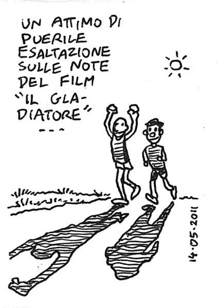 Stefano si è fissato con la musica del film “Il Gladiatore”. Nessuno dei due ha un I-pod, per cui siamo costretti a fischiettarla. – Just for joke, sun declining on our back, we were running with “The Gladiator” theme as soundtrack… Allenamento pomeridiano a Villa Pamphili. 1h05′ L, STR. Link to this articleI pomicioni / Petting