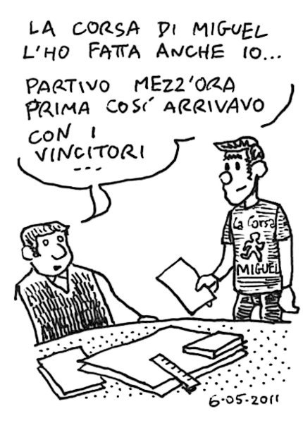 Il personaggio della vignetta è un cliente che è passato a studio nel pomeriggio. Non avrei mai sospettato che fosse un runner. – I didn’t suspect that this guy had been a runner. “I ran Miguel’s Race too, leaving in advance so to finish with the winners…” PM via dei Genieri. 4km L, STR, 4 x (300 L + 1km) (3’55, 3’55, 3’58, L), STR. Un bell’allenamento. Per ora evito di correre al massimo. Link to this article