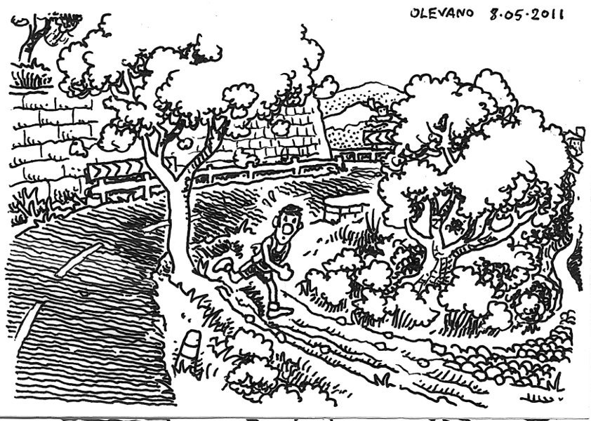 Trasferta sociale con gara paesana ad Olevano Romano. – A very relaxed race in Olevano Romano, peppered by a defiance from a team mate. Mixed track with lots of climbing. Aldilà della sfida lanciatami da un compagno di squadra (Dago), devo dire che mi ero ben preparato, presentandomi in ottima forma (a parte una mezza ciucca la sera prima con conseguente sveglia alle tre di notte). Arrivo in ritardo, non c’è tempo per riscaldarsi, ma il clima generale è molto rilassato. Dago arriva quando siamo già sulla linea di partenza, la parte peggiore di me gongola. Partenza, ci tira uno dei padroni di casa (almeno fino al cimitero) e subito si presenta la prima salitona a fare selezione. Stringo i denti e per un po’ riesco a rimanere agganciato ai primi, giù per una pietraia. Capizzi e il Presidente mi staccano a tre quarti del primo giro. Da quel momento corro praticamente da solo, perso in una podistica terra di nessuno. Al secondo giro intravedo una concorrente che prende la scorciatoia (non sapevo che era Vera, nuova compagna di squadra, l’avrei avvertita)! Al terzo riacciuffo un giovane concorrente autoctono (camminava in salita!), speranzoso gli chiedo quanti sono i giri in totale, non sia mai che abbia capito male. Ho capito bene, i giri sono quattro. L’ultima salita la affronto con stoicismo e una lingua secca come la suola delle scarpe, sobbalzo ad ogni rumore proveniente da dietro le spalle, ma, giuro, controllo una volta sola (vedi vignetta, ho ricostruito il punto in cui si lasciava la strada prima della pietraia, il percorso faceva un gomito e si potevano vedere eventuali inseguitori, così mi avrebbe colto un Dago in caparbia rimonta). Arrivo e sono distrutto, mi devo sedere su un gradino all’ombra. Durante tutto il pranzo dei De Persio (padroni di casa) ciondolo con la testa vuota. I giorni successivi ho crampi ovunque a partire dai glutei. Ed era solo una trasferta paesana. Link to this articleL’insospettabile / Beyond suspicion