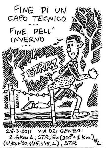 La vignetta è dedicata ad un mio compagno di squadra impegnato nel suo primo Trail della Capitale ai Pratoni del Vivaro (18km con 1000m di dislivello). Il mestolo è un simbolo negativo che viene affibbiato annualmente per motivi di demerito. – The Dipper is a negative symbol yearly awarded to a team member. This year’s owner is performing the Capitol Trail, 18km in the woods near Rome. AM, Villa Pamphili, circa un’ora e mezza di corsa lenta. Il mio allenamento non si può paragonare alla prestazione di Serra, Scozzarella e Vasta (rispettivamente 2°, 14° e 17°), ma è una buona preparazione per un eventuale futuro trail. Link to this articleStrappo alla regola / Stripped