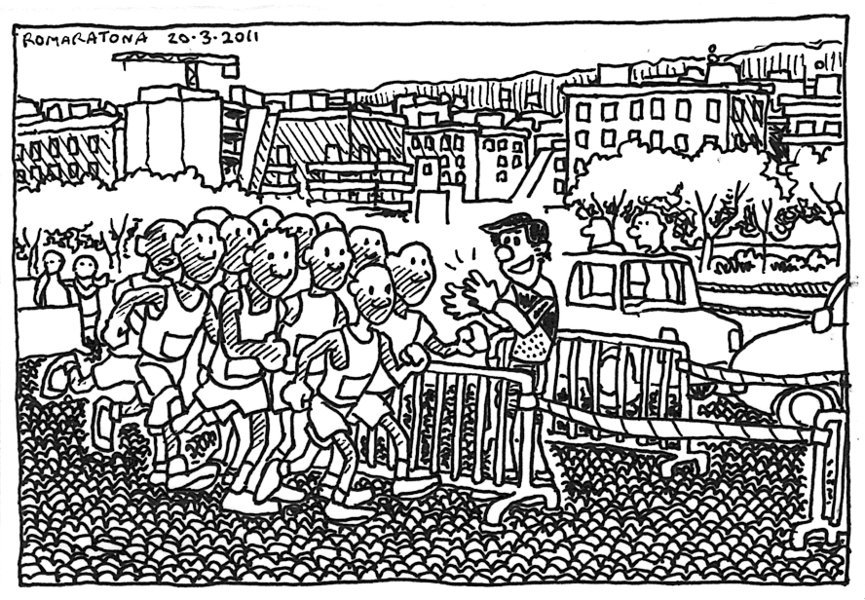In mezzo all’allenamento mi apposto al decimo km sul percorso della Maratona di Roma (ponte davanti al mattatoio). Vedo passare i primissimi, un blocco compatto di africani con magliette sgargianti. Quello che più mi impressiona è che hanno un passo talmente felpato che quasi non fanno rumore! Troppe bici, moto, auto dell’organizzazione – In the middle of the training I watch the marathon passing by. The head of the race is a solid block of africans. They seem to glide on the pavement! Around, too much noise, too much bikes, cars, vans… AM, Villa Pamphili, via Portuense, 1h L. Link to this article17th Roma Marathon