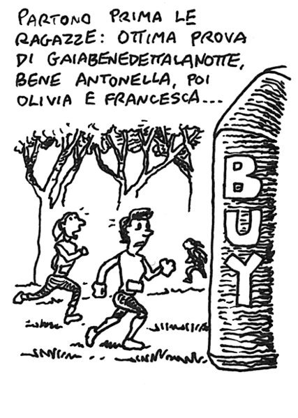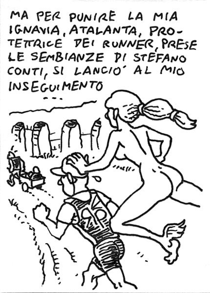 Il martedì mattina mia figlia entra a scuola un’ora dopo e quindi ho mezz’ora in più a disposizione per l’allenamento, messa a frutto con 14km di FL. Di solito i lunghi li faccio nel fine settimana, ma ultimamente questi sono occupati da gare (brevi, peraltro). Mentre meditavo su questa frustrante congiuntura, un topolino in corsa mi ha accompagnato per qualche metro… – I should be building up endurance before Roma Ostia half marathon, but weekends, that I normally devote to long runs, are actually occupied by short races. As I was mumbling on this frustrating situation, a small mouse joined me for few seconds… Link to this articleDaily kOmiX, Gennaio / January 2012